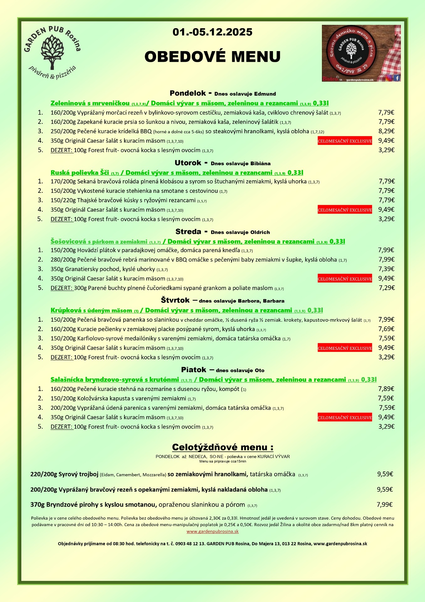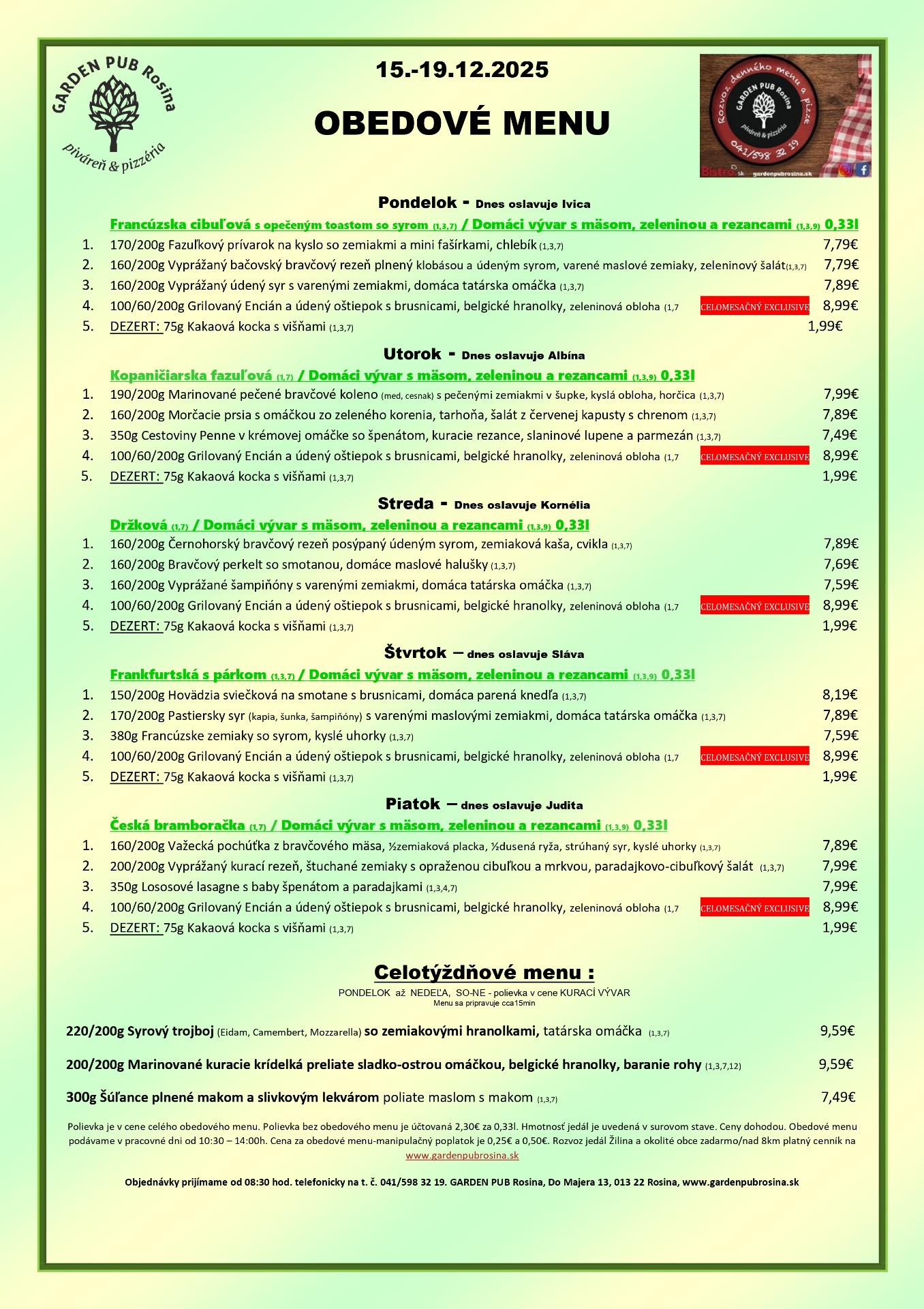 Pondelok až Piatok v čase od 09:00 hod. a SOBOTA, NEDEĽA v čase od 11:00 hod. je možná telefonická objednávka na tel.č.: 041/598 32 19